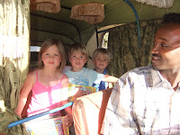 Back to our little compound camping and off early the next morning as both boys vomited all night and guess who was on clean up duty? As our facilities were negligible we decided to set off immediately south to a campsite we knew was run by a Dutch couple. This campsite was right on the banks of Lake Tana, in Gorgora; a terrible road to get there but once there you enjoy peace and quiet and no more hassle from the local kids (“pen,pen,pen”, “money,money,money”, “you, you, you”). There is no running water because 3 of the local villagers are employed at 19Birr a day (about £0.60) to carry water from the lake. Mara immediately came to report that the toilets were spotless, sparkling AND even had toilet paper! They don't flush but you pour lake water down to flush. You can choose to wash either in the quaint bamboo hut where there is a tin bucket on the roof which you unleash with a twist to be blasted with fresh lake water, or you can meander over the rocks to a little enclosed bay on the Lake and wash there. We bathed in the lake every day (yes bilharzia is present but you should hopefully be ok if you stay in for less than 10minutes and don’t bathe anywhere near the local animals.....hmmm....will keep you posted on that one).